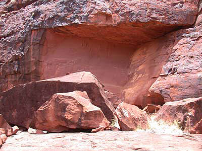 Finke Gorge National ParkFinke Gorge National Park covers an area of 46,000 hectares and includes Palm Valley. The park is 138 km (about 2 hours drive) west of Alice Springs and is west of and close to Hermannsburg. Here are some typical scenes from the park. The plant in the second photo from the left is widely called "spinifex" but technically is Triodia, a pointy, hummock-forming grass that is extremely common in Central Australia. (True spinifex is a coastal plant and a different genus.) The variety shown here is Triodia basedowii, which is blue-gray. You need to watch out for this stuff when you hike, especially in shorts. Spinifex resin is an important plant for the Aborigines and is used as an adhesive in spear-making, among other applications. Its seeds are ground to make cakes, and it is used for smoke signals, as it produces a strong black smoke. Palm Valley"Our trip to Palm Valley was with AAT Kings, which seems to be the largest tour company in Australia, and certainly the largest we travelled with on this trip. The vehicle wa sa 4WD bus: a truck bed with a bus body on it. I've never seen anything like it, but it worked just fine." - Larry the O mlog Left to right: Welcome sign, AAT Kings bus, rest spot where we had lunch. "The Palm Valley is in the MacDonnell Ranges outside of Alice. The entire area was, at one tine, an inland sea, and there are still remnants of that history if several hundred million years ago. (In fact, rock in the area has been carbon-dated as the oldest ever found on the planet.) "The Palm Valley is a rather small river (the rivers in the Red Centre are usually dry but become wet with a vengeance when it rains, turning into raging torrents. Although not used here, 'wadi' is the common word for dry rivers like these) that features unusually lush growth for a semi-arid region (technically, it gets too much rainfall to be considered desert), including the red cabbage palm, which grows nowhere else on Earth. "How do palm trees live where there is virtually no water or soil? They live in a riverbed where silt has been deposited over time from when rain does fall and water flows. Beneath the silt is sandstone, which holds water, under which is a layer of denser rock that will not pass water, thus creating a water table. Further, the walls of the small canyon that is Palm Valley are also sandstone, which holds the water and then slowly releases it. Thus, this little, dry canyon has plenty of growth in it. "Oone other distinguishing characteristic of the Palm Valley area is that it contains more varieties of ants than anywhere else on the planet, over 300 different varieties. Ant scholars come from all over the world to study the little buggers here. That's nice for them." - Larry the O mlog