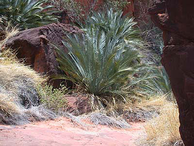 A Hike Among the Red Cabbage PalmsAbout 300 million years ago, this area was a rainforest, and like some other rainforests of the time, it had red cabbage palms. Today, these palms are extinct except in Palm Valley, in Australia's Northern Territory. Our first hike took us atop a ridge, then along a path to the bottom and back along the base of the ridge to the tour bus. At second row, center is Triodia pungens, a green variety of spinifex. You get a good view of the rare red cabbage palms in several of these photos (see the third row). That's papyus at the bottom right.
