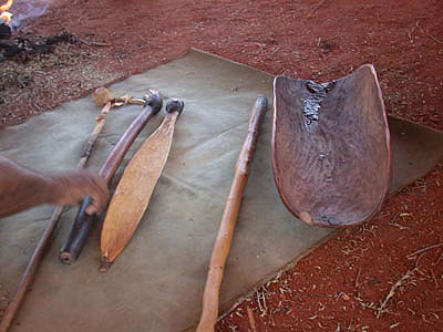 Anangu Aboriginal Tour"From there. however, things got more interesting, as we went to the Aboriginal Cultural Center owned and operated by the Anangu. Anangu Gours does not select their white employees in any traditional fashion: there are no job applications, no resumes, no tour guide experience is needed. In fact, it seems that they generally recruit people who have been around them for a year or more. "Tony [our driver and guide in the early morning] became a sort of 'assistant tour guide' from the time we reached the cultural center. Our tour guides from that point were a tag team: Senior Aboriginal Guide Sammy Wilson (his English name), one of the company's owners and a quite remarkable man, and Katia, a white woman who acted as his interpreter. Sammy explained that we were on his land as his guests and, as such, he chose to speak his language, the language of that land. Katia had been studying and generally hanging around the Anangu and learning their language whne they completely freaked her out by asking her to be an interpreter. She felt wholly inadequate to the task, but they wanted her eloquence in English and told her to have faith and they would train her. "Of course, she became a superb interpreter, more than a translator, since she tries to capture the poetry of how Sammy speaks. Sammy is a leader of the his tribe, as was his father and his father's father. In fact, his Aboriginal family name is Uluru, so he is quite literally Mr. Uluru. To once again point out how recent development of European settlement has been, Sammy's grandfather was one of the tribal leaders at the time of first contact with whites. "Sammy himself, in his youth, was known for stunts like hunting kangaroo by chasing it on a motorbike, grabbing it by the tail, flipping it over (in the Red Center, you find red kangaroos that can grow up to eight feet tall), and then killing it with a single strike of a club. He was known to do this on multiple occasions. On the day we were with him, he demonstrated spear throwing so accurate that he twice came within inches of hitting a stick in the ground thirty feet away. Had it been anything larger than a mouse, it would have been dead. Very impressive." - Larry the O mlog Sammy and KatiaAnangu Tools"Sammy and Katia walked us out toward Uluru and taught us about the tools used by the Anangu, including how they were made and how they were used, both the men's and women's tools. He demonstrated and let us try spear throwing, then walked us to a choice spot in the shadow of Uluru and talked about his tribe's relationship with Uluru, why they don't want people climbing (they feel that those that come, climb the rock, and leave witout even understanding its meaning to the Anangu are missing the point of its existence), and gave just a small taste (a child's fable, essentially) of tjukurpa: the cultural definition/law/lore that defines their lives. It was an experience entirely unlike any I've known, very deep and with people (both Sammy and Katia) whose presence was strongly inspirational. And all of this was before 10 a.m.!" - Larry the O mlog In the photo at left, men's tools are to the left, women's to the right. Sammy's hand is on the club, a heavy weapon that can kill with a blow. The black substance at the end, also used to repair the bowl (right), is called piti, and Sammy showed us how to make it. The photo at center shows a belt made of human hair. At right, Larry is once again trying his hand at throwing a spear. He did better this time than he did at Tjakupai!