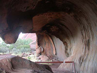 The Blue-Tongued Lizard Man is a key actor in the Uluru story. The cave from which he fell to his death is located at upper right.